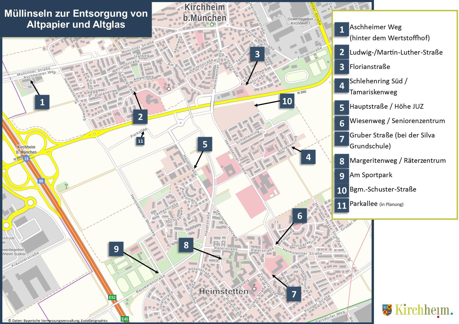 Seit dem 01. Februar 2026 übernimmt die Firma Knettenbrech + Gurdulic Süd GmbH die Sammlung und Beförderung von Bio- und Restmüll in der Gemeinde Kirchheim b. München. Die Firma Wilm Entsorgung-Recycling GmbH ist weiterhin für die Leerung der Papiertonnen zuständig. Für die Sammlung/Leerung der Gelben Säcke/Tonnen ist die Firma Remondis zuständig. Wir weisen darauf hin, dass die Zuständigkeit nicht bei der Gemeinde liegt, sondern bei den Systembetreibern des Dualen Systems in Deutschland (DSD). Tel.: 0800 1 22 32 55
