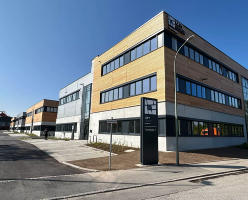 Der nachhaltig errichtete Gewerbepark bietet mit über 13.000 m² Bruttogeschossfläche flexible Nutzungsmöglichkeiten für Unternehmen.