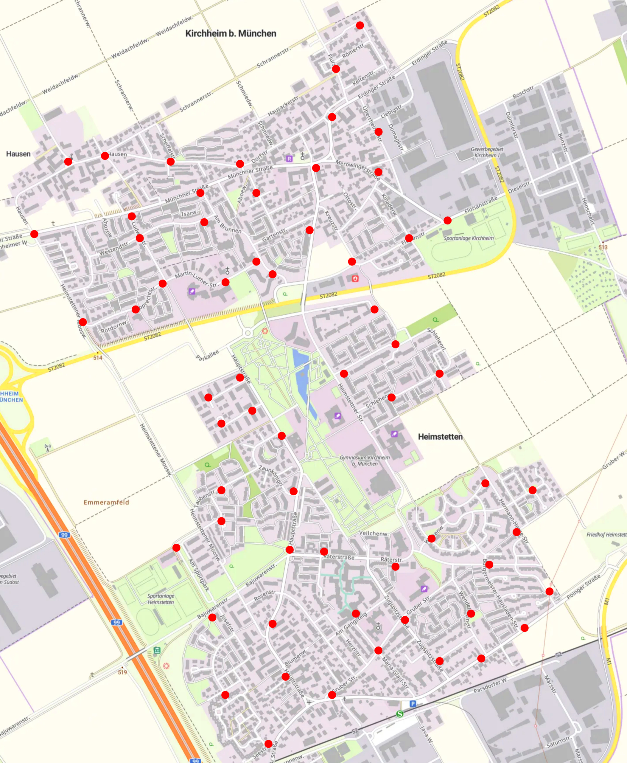 Bitte legen Sie Ihren Baum bis Samstag 10.01.2026 – 9 Uhr – an eine der unten in rot gekennzeichneten Sammelstellen.
