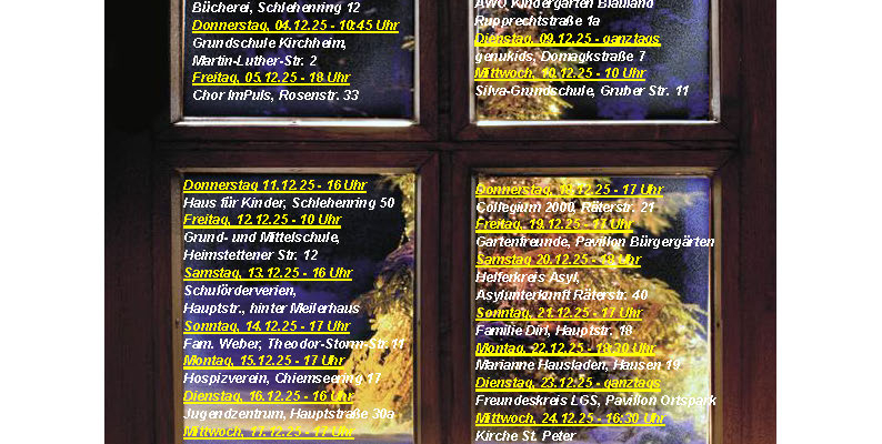 Eine Übersicht aller Kirchheimer Adventsfensterl finden Sie auch auf der letzten Seite der aktuellen Kirchheimer Mitteilungen.