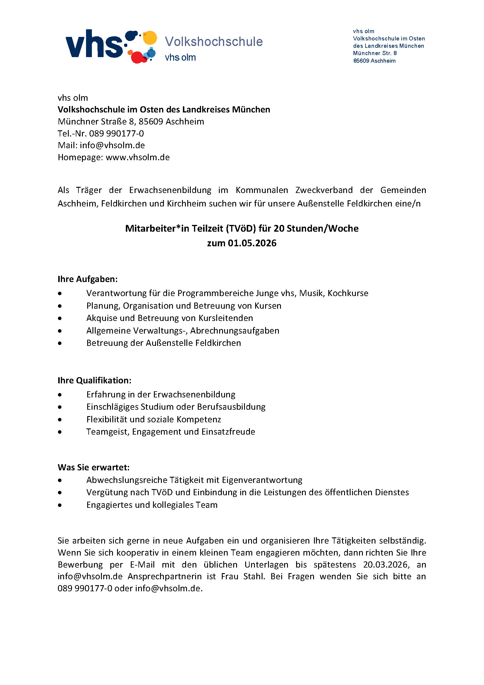 Sie suchen eine herausfordernde Aufgabe mit geregelten, aber flexiblen Arbeitszeiten? Sie organisieren gerne und bewahren auch in hektischen Zeiten den Durchblick? Sie arbeiten gerne selbstständig, sind aber trotzdem ein Teamplayer und wünschen sich ein wertschätzendes Miteinander? Dann kommen Sie zu uns ins Team des Zweckverbands Staatliche weiterführende Schulen im Osten des Landkreises München und unterstützen Sie mit uns unsere spannenden Hochbauprojekte und die Bestandsschulen.