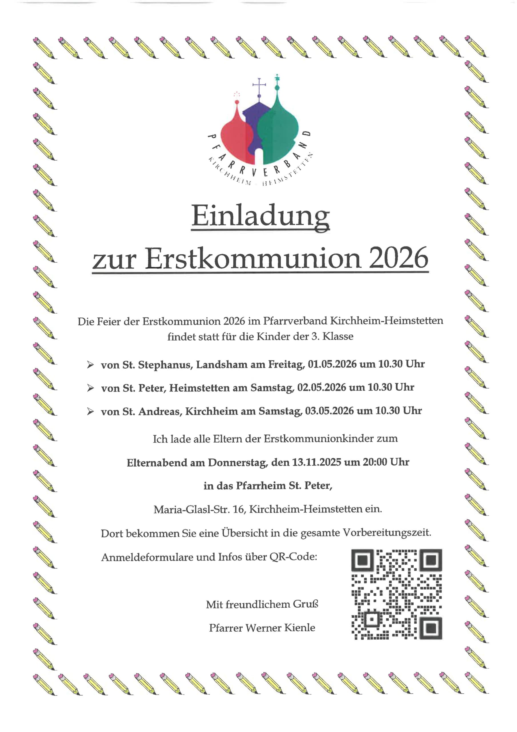 Infoabend Erstkommunion 2026 13.11.2025 20:00 Pfarrsaal St. Peter Familien Zurück Details Beginn: 13. November 20:00 Ende: 13. November 21:30 Eintritt: kostenlosOrt Pfarrsaal St. PeterVeranstalter Werner KienleDeutschlandKontakt st-peter.heimstetten@ebmuc.de