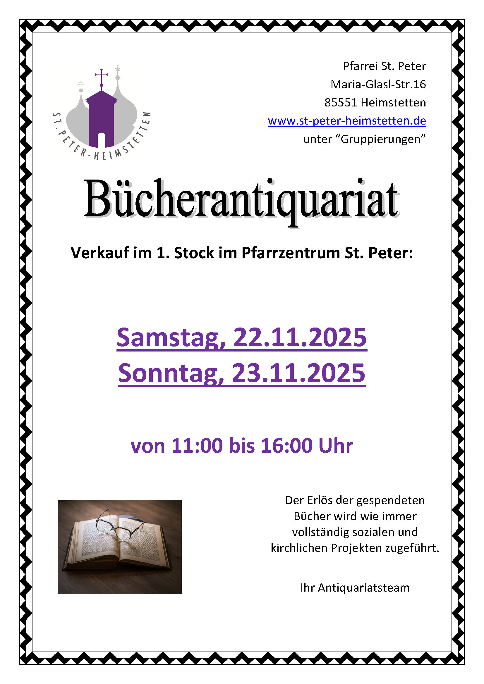 Bücherantiquariat Verkauf im 1. Stock 23.11.2025 11:00 Pfarrheim St. Peter - 1. Stock Markt Zurück Details Beginn: 23. November 11:00 Ende: 23. November 16:00 Eintritt: kostenlosOrt Pfarrheim St. Peter - 1. StockVeranstalter PV Kirchheim-Heimstetten Elfriede WitzlebenKontakt st-peter.heimstetten@ebmuc.de
