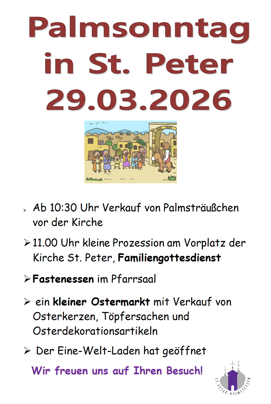 Palmsonntag 29.03.2026 11:00 St. Peter Heimstetten Familien Zurück Details Beginn: 29. März 11:00 Ende: 29. März 14:00 Eintritt: kostenlosOrt St. Peter HeimstettenPV kirchheim-HeimstettenVeranstalter Werner KienleKontakt st-peter.heimstetten@ebmuc.de