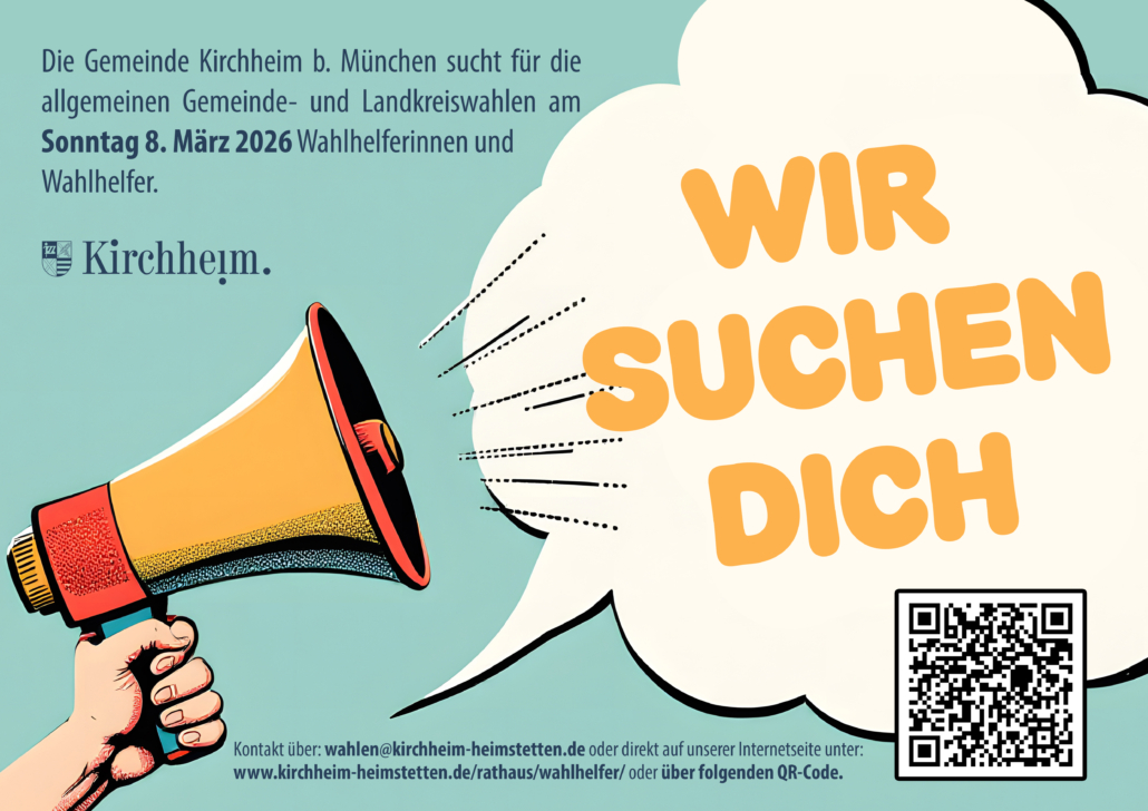 Die Gemeinde Kirchheim b. München sucht für die allgemeinen Gemeinde- und Landkreiswahlen am 08.03.2026 engagierte Wahlhelferinnen und Wahlhelfer. Haben Sie Lust, bei der Wahl hinter die Kulissen zu blicken und sich für die Durchführung dieses wichtigen Vorgangs zu engagieren? Wir freuen uns, Helferinnen und Helfer zu begrüßen, die uns bereits bei vergangenen Wahlen tatkräftig unterstützt haben, aber auch neue Gesichter sind herzlich willkommen.