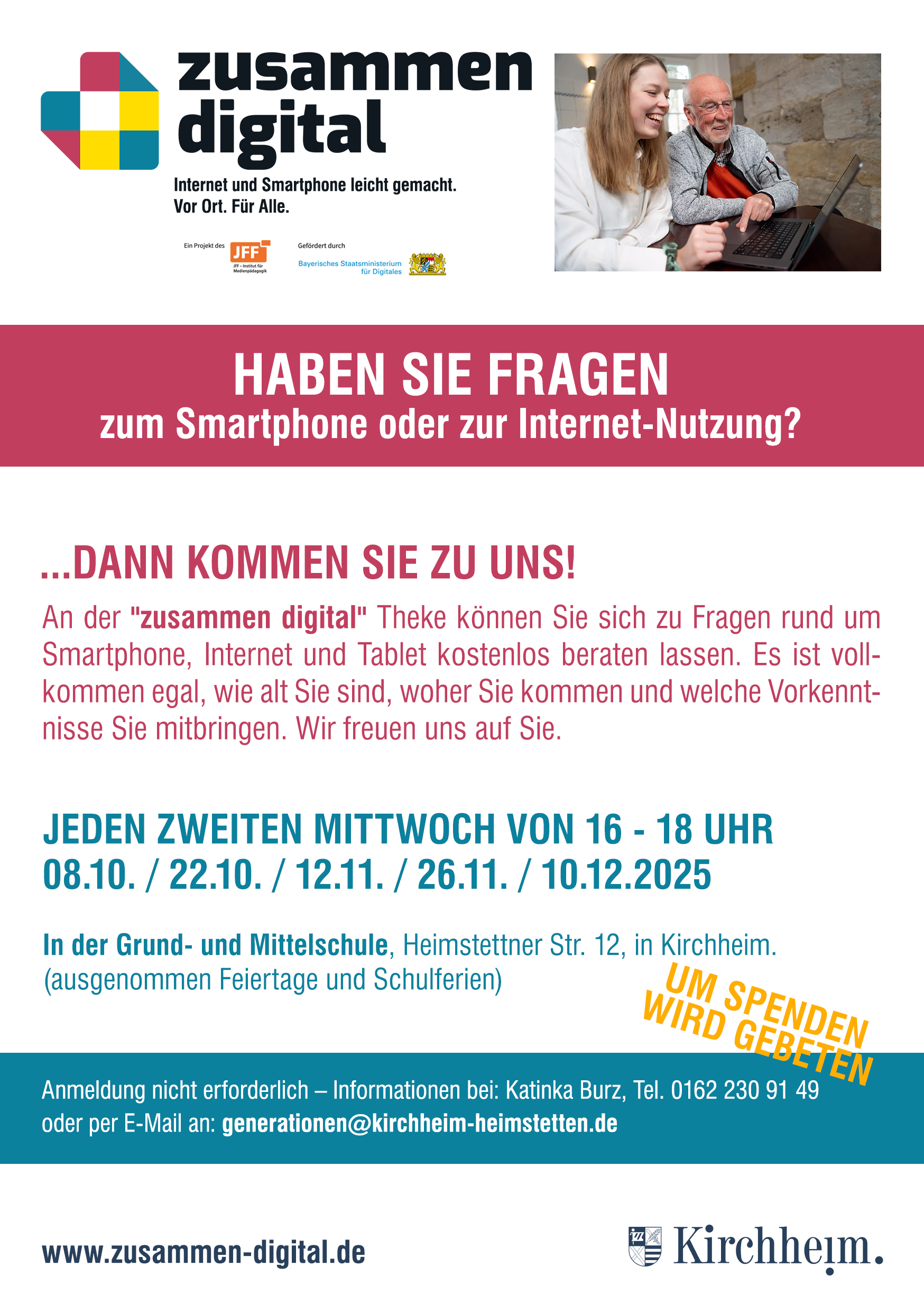 Bayerische Bürgerinnen und Bürger erhalten ab sofort umfangreichere kostenlose Unterstützung bei individuellen Digital-Fragen: Die Gemeinde Kirchheim bei München gehört zu den 16 neuen Kommunen, die im Rahmen des vom Bayerischen Staatsministerium für Digitales geförderten Projekts „zusammen digital“ eigene Beratungstheken einrichten. Zielgruppe sind besonders digitale Einsteigerinnen und Einsteiger – ihnen soll das Projekt Hilfe bei ganz individuellen Alltagsfragen zu den Themen Internet und Smartphone bieten. Dabei kann beispielweise erklärt werden, wie Online-Angebote von Banken oder des öffentlichen Nahverkehrs genutzt werden können.